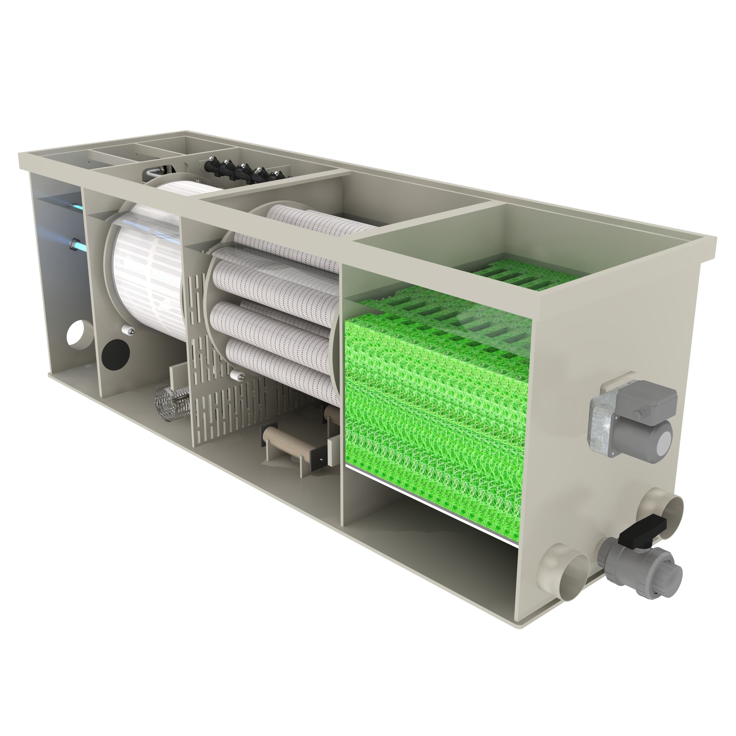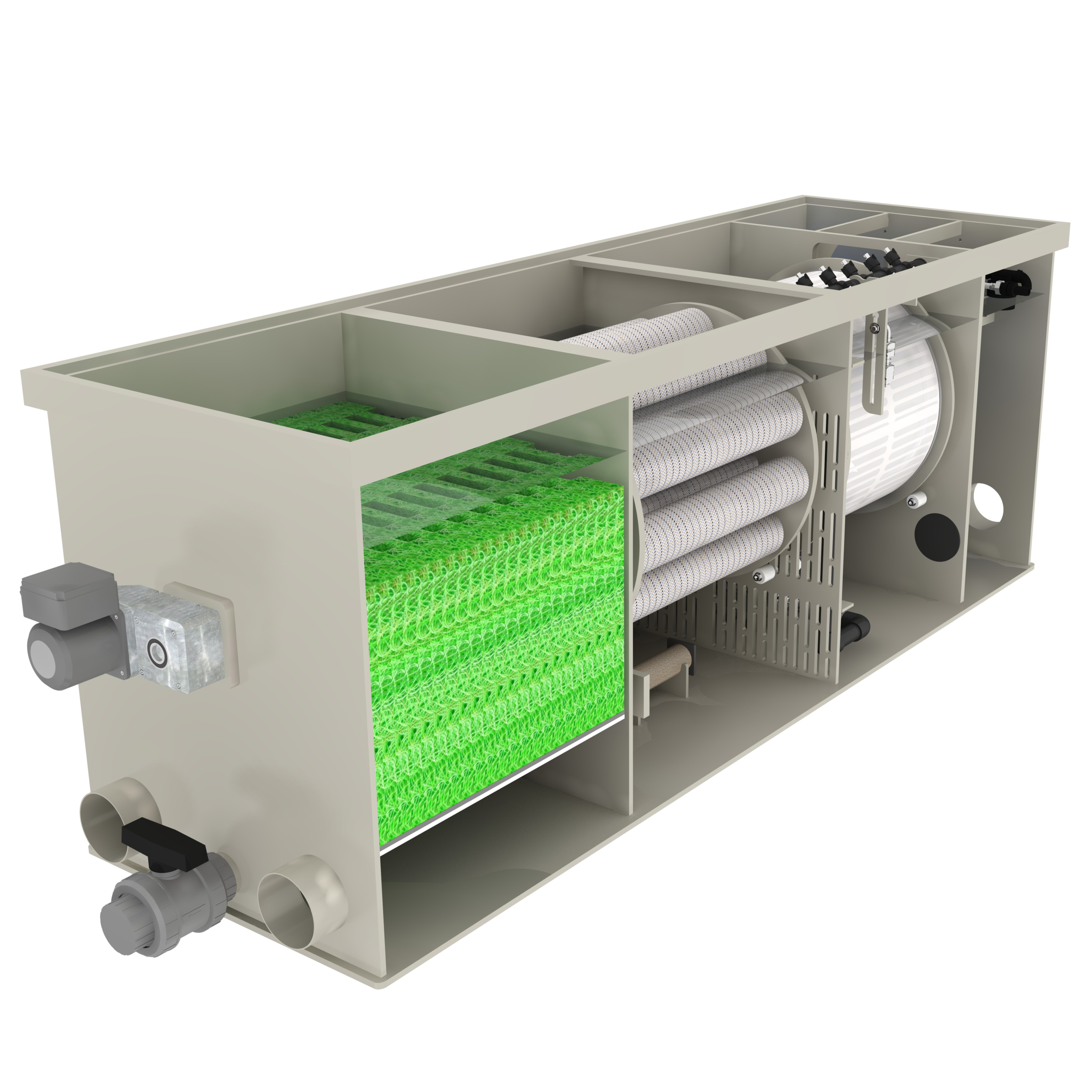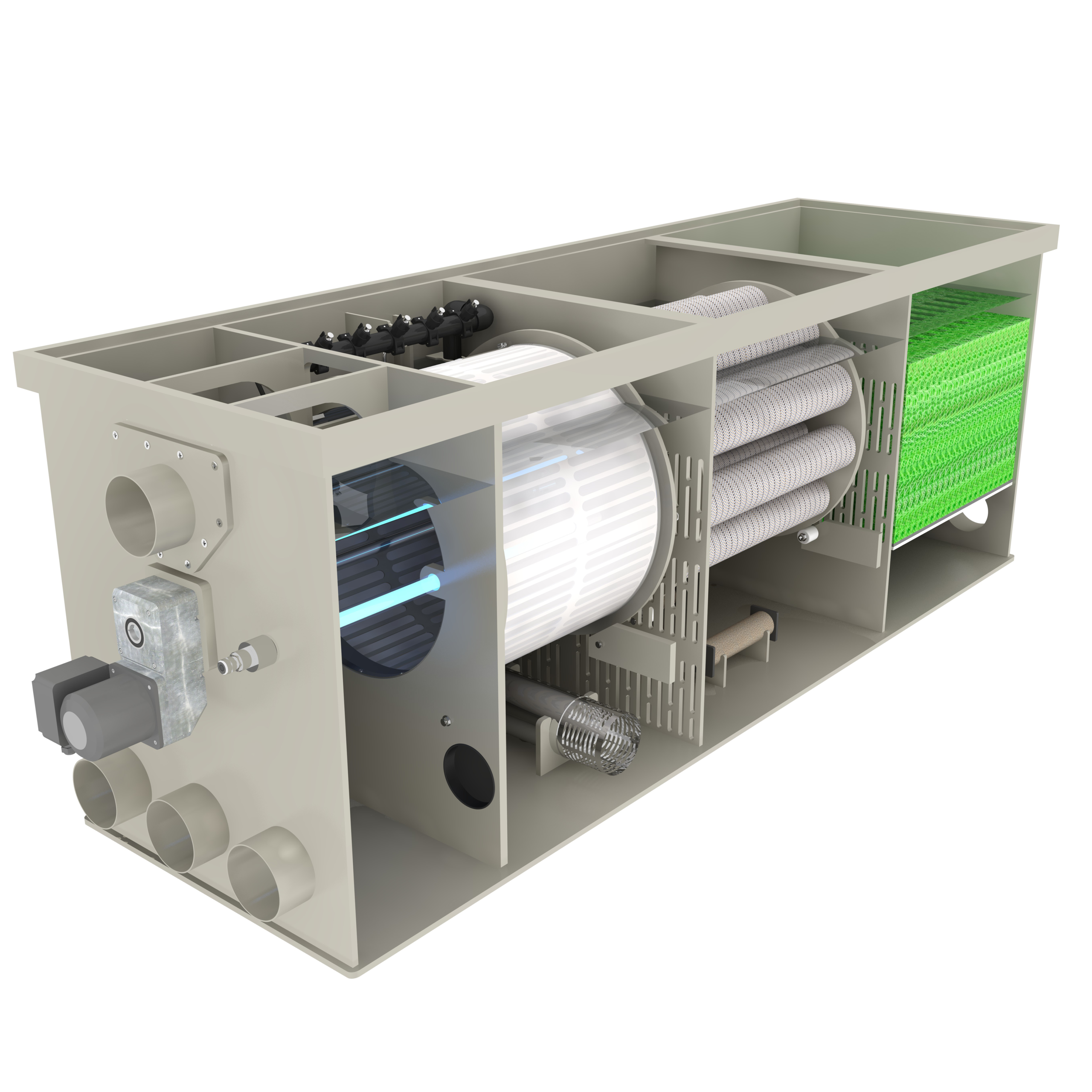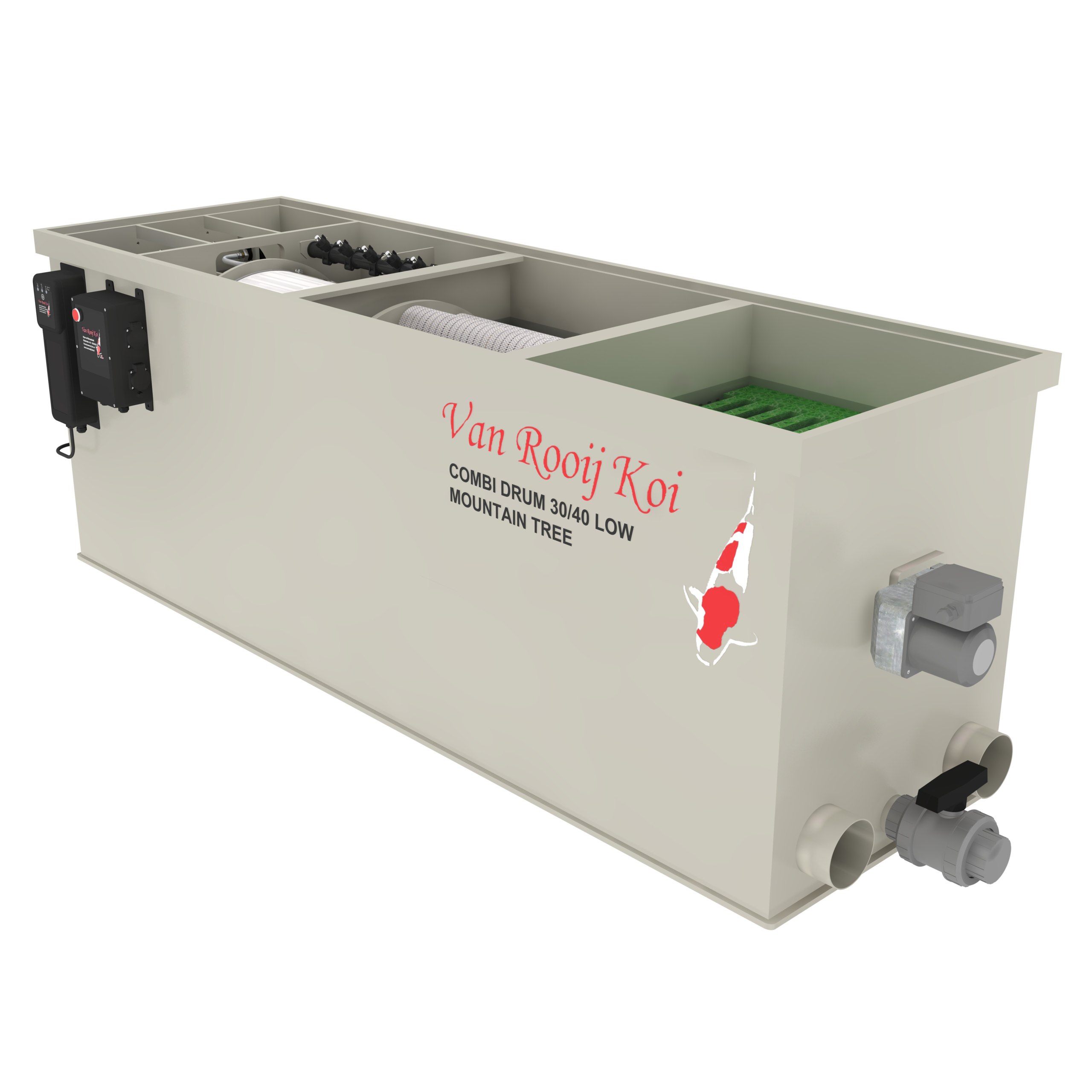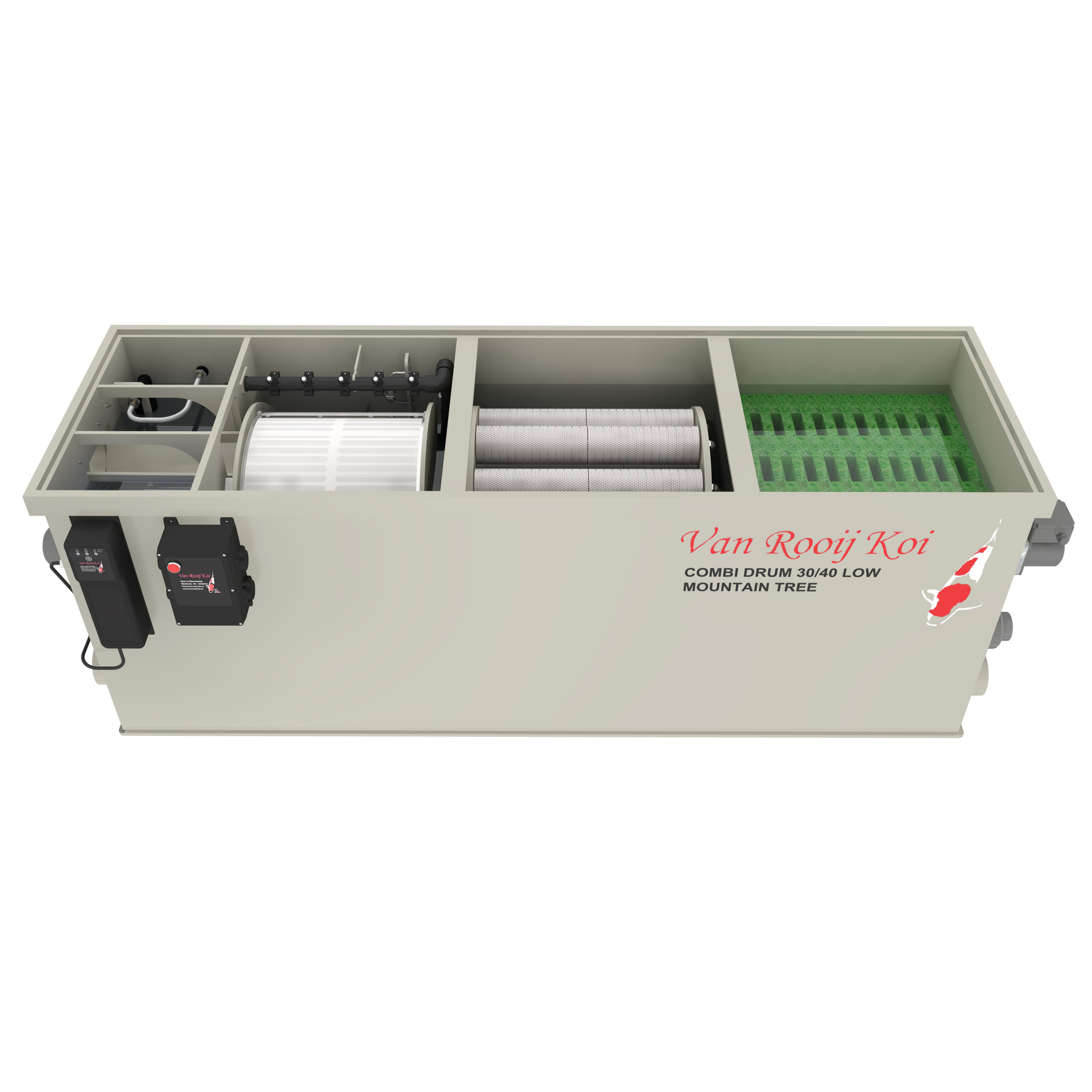 De COMBI DRUM 30/40 LOW van Mountain Tree is een geavanceerd filtersysteem voor koi- en siervijvers tot ongeveer 40 m³. Deze compacte combifilter is speciaal ontworpen voor situaties met beperkte ruimte, zonder in te leveren op prestaties. De combinatie van een volautomatische trommelfilter en een geïntegreerde bio-kamer zorgt voor een efficiënte en betrouwbare waterzuivering.